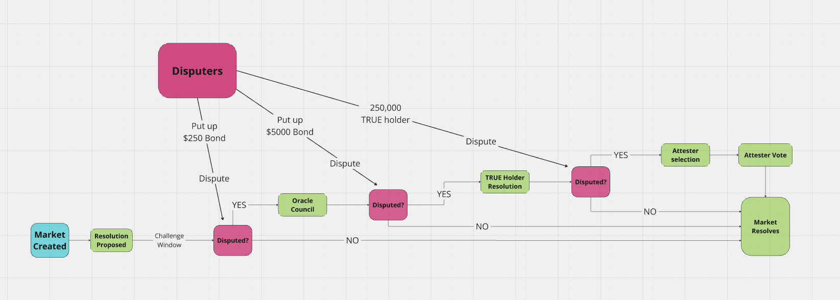 To challenge an initial proposal, a small bond is required. To dispute an Oracle Council decision, a larger bond must be pledged. Finally, in order to dispute a token holder vote, a wallet with at least 250,000 TRUE tokens (or equivalent vote power) must file a dispute.