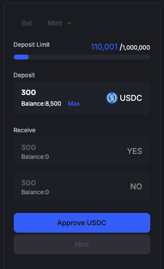 To mint YES and NO tokens, users simply approve their USDC and mint 1 YES and 1 NO token for every 1 USDC deposited.