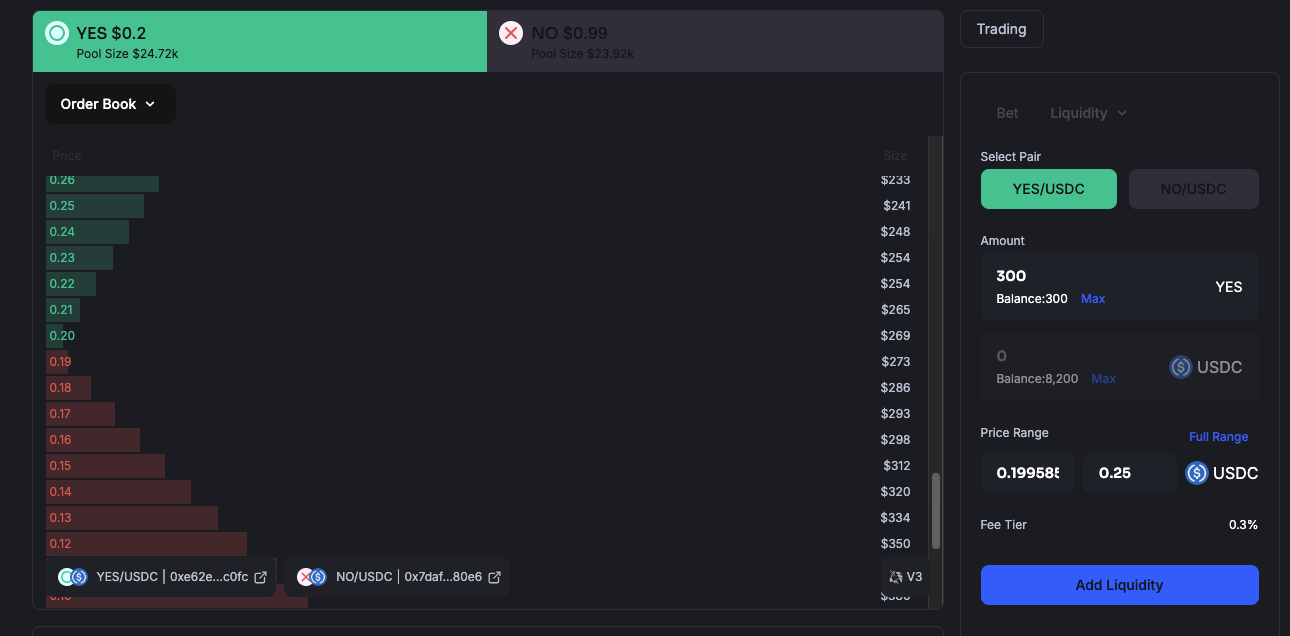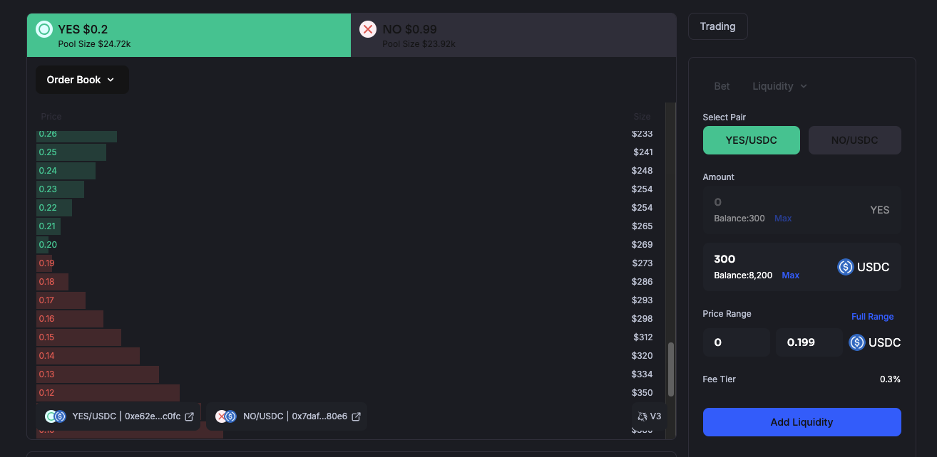 Every market has a corresponding YES-USDC pool and NO-USDC Uniswap pool. Although there aren’t any bounds on the range of liquidity, the price of YES or NO tokens should never go above $1, because that is the maximum redeemable value for each token.