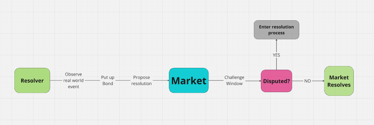 Based on the rules of resolution in a market description, anyone is allowed to determine whether the market question has been answered and permissionlessly propose a resolution by posting a bond behind their selected outcome.