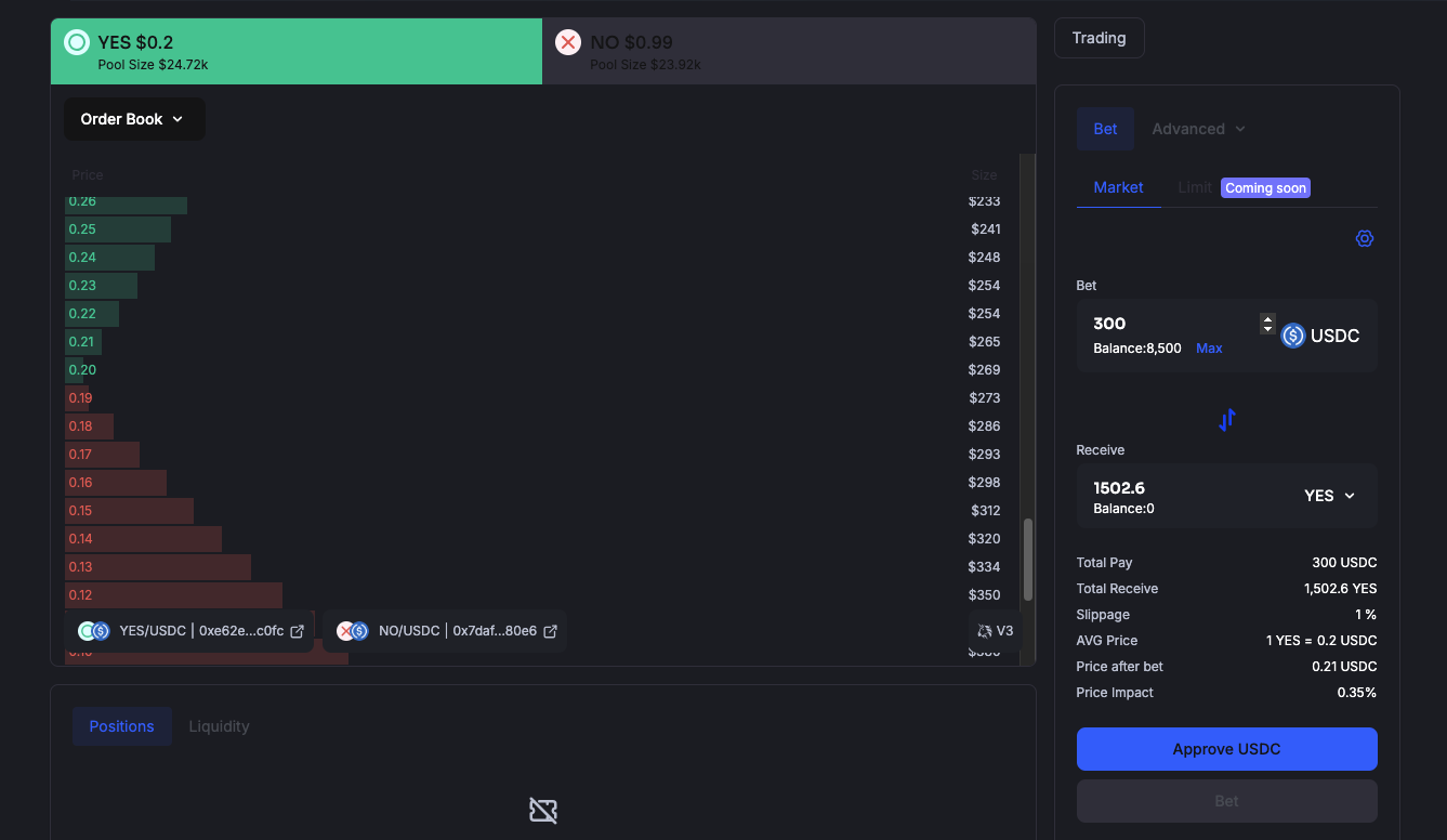 To purchase YES or NO tokens, users simply approve their USDC for spend and place a bet. Directly above the buy button, the trade summary displays the exact quote, conversion rate, and price impact for the trade.